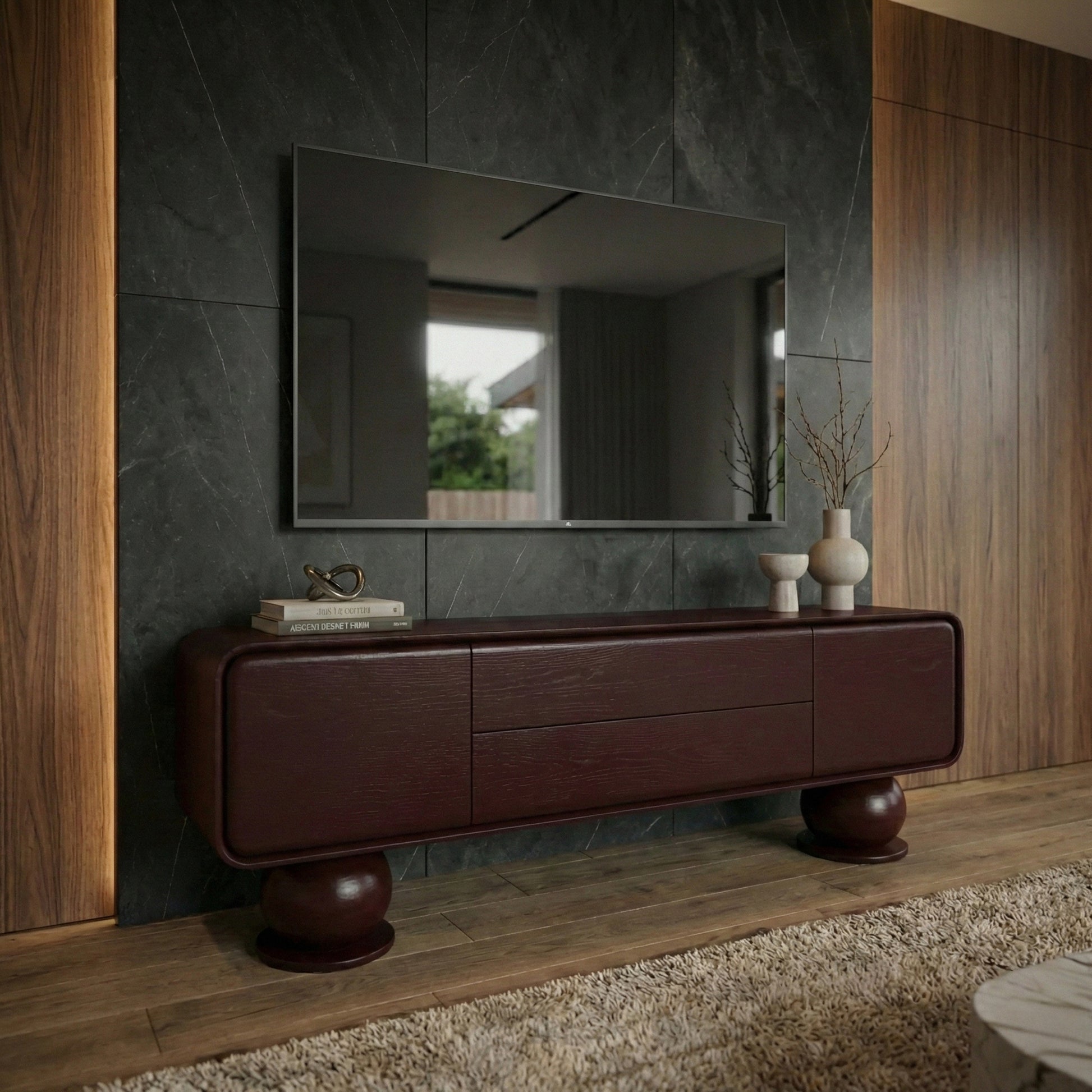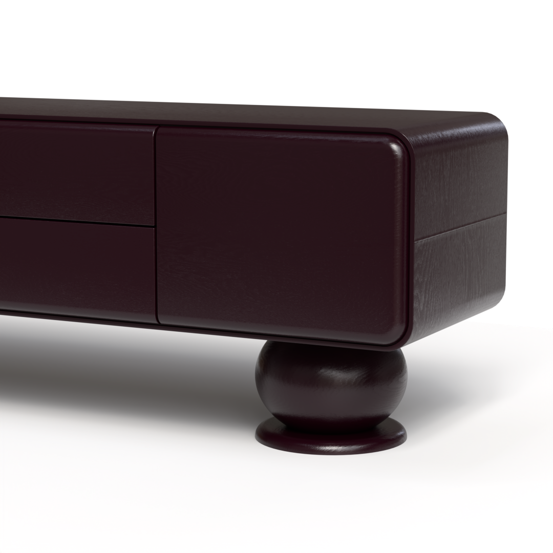 Evinizin havasını değiştiren bu tasarım, yuvarlak ve dikkat çekici ayaklarıyla sadece bir TV ünitesi değil, aynı zamanda estetik bir obje olarak da ön plana çıkıyor. Zamansız tasarımı ve doğal malzemesiyle, hem modern hem de klasik tarzda döşenmiş mekanlara uyum sağlar. Her gün kullanılacak bir eşya olmasının yanı sıra, evinizde zamansız bir zarafet katmak için tasarlandı.