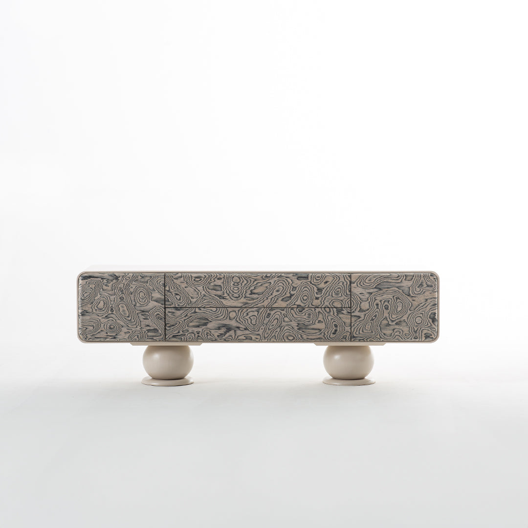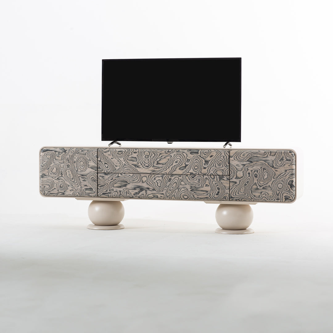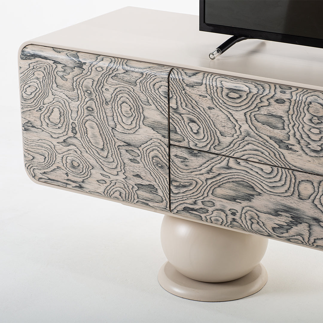 Evinizin havasını değiştiren bu tasarım, yuvarlak ve dikkat çekici ayaklarıyla sadece bir TV ünitesi değil, aynı zamanda estetik bir obje olarak da ön plana çıkıyor. Zamansız tasarımı ve doğal malzemesiyle, hem modern hem de klasik tarzda döşenmiş mekanlara uyum sağlar. Her gün kullanılacak bir eşya olmasının yanı sıra, evinizde zamansız bir zarafet katmak için tasarlandı.